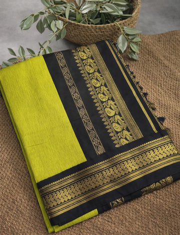 Parrot Green and Bottle Green Kalyani Cotton Saree with Copper Zari Peacock Border