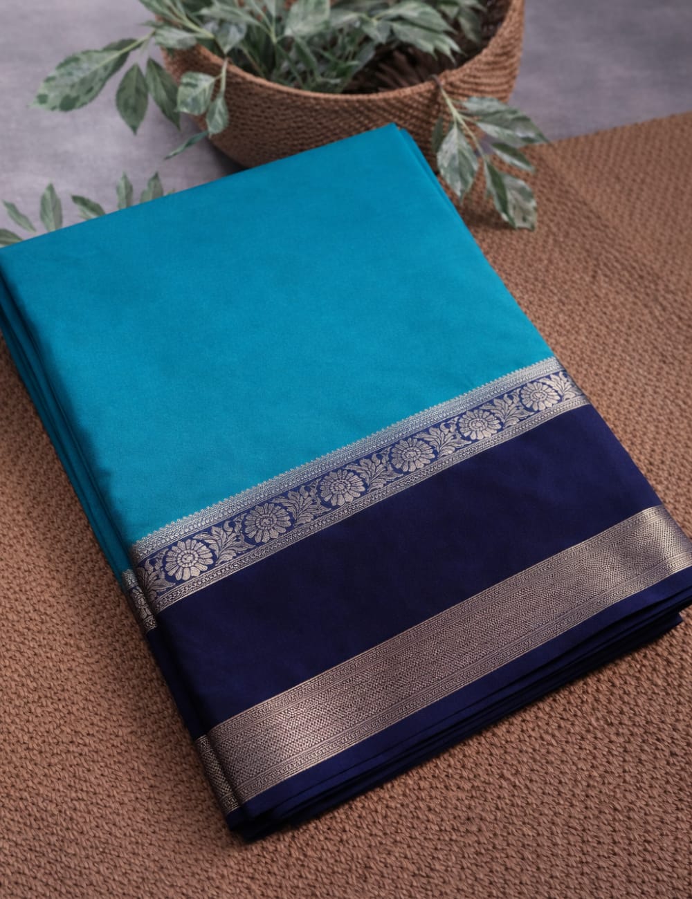 “Teal Crepe Silk Saree with Elegant Dark Navy Blue Border”