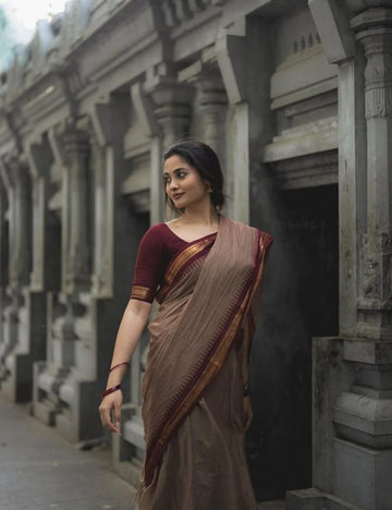 Grey and Wine Kalyani Cotton Saree with Traditional Temple Border