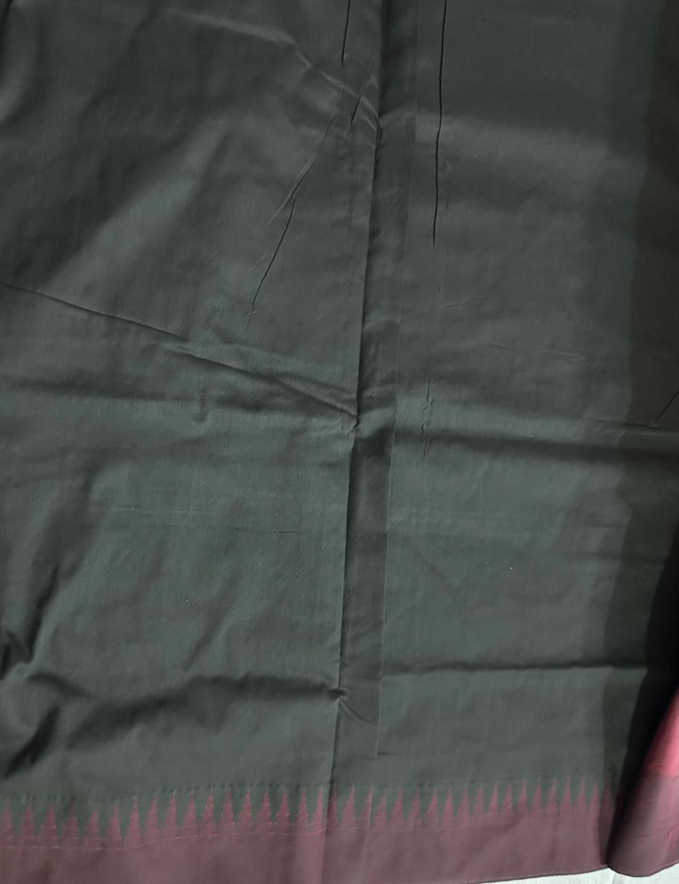 Deep black body with a contrasting maroon border accentuated by subtle golden zari stripes. Finished with elegant black tassels that enhance its handcrafted appeal.