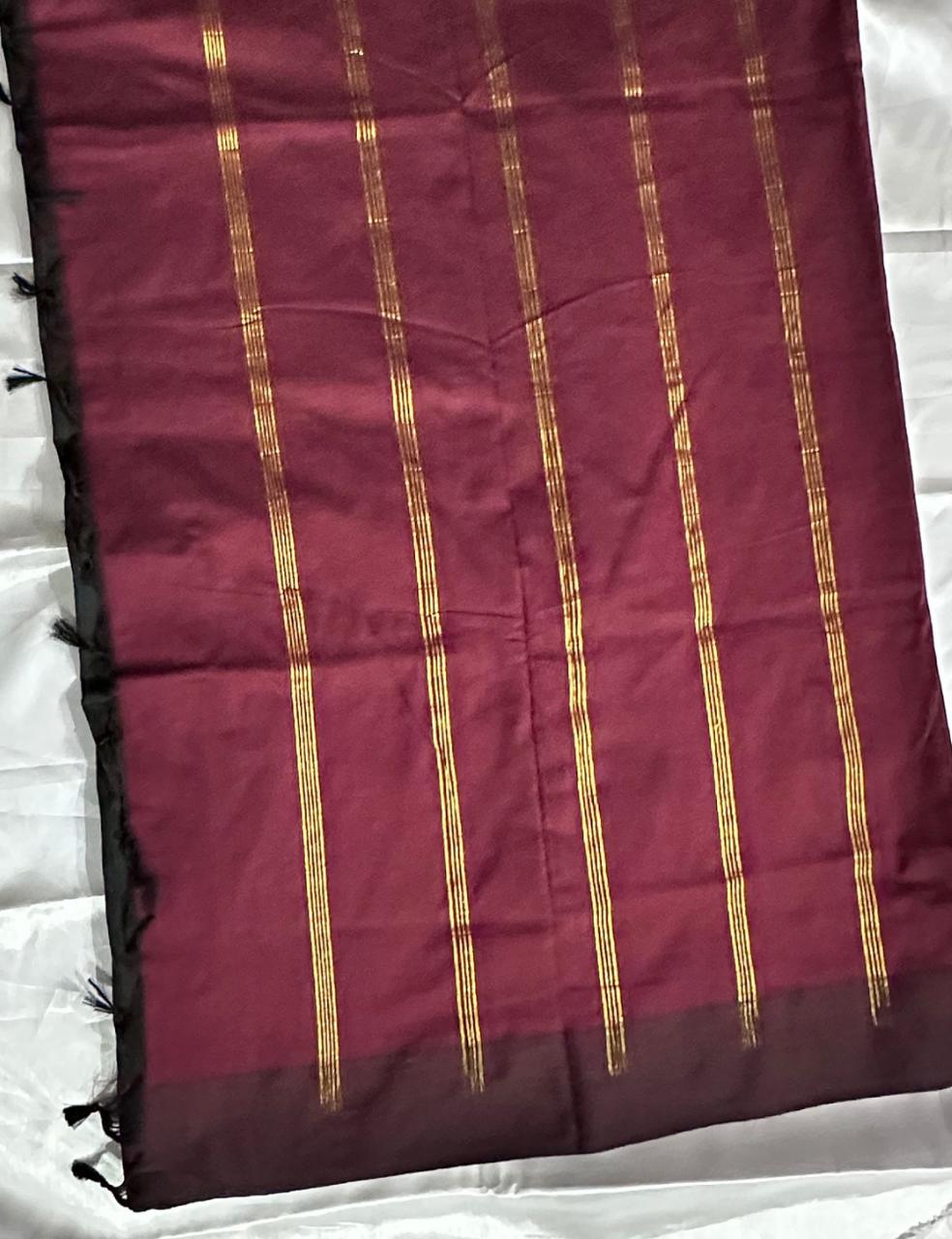 Black and Maroon Kalyani Cotton Saree with Elegant Golden Zari Lines