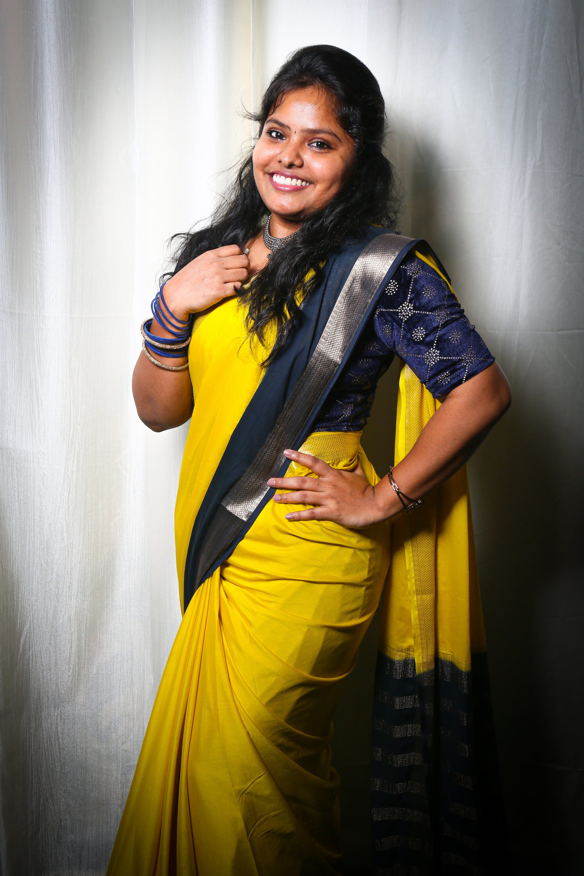 LEMON YELLOW AND NAVY BLUE CREPE SILK SAREE WITH A GOLDEN ZARI BORDER
