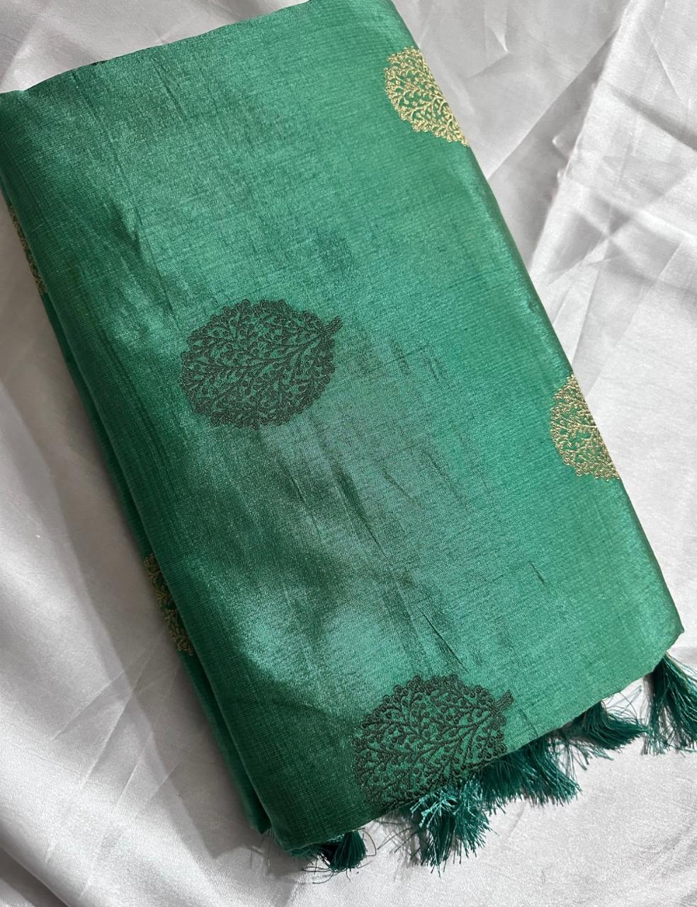 This elegant pure Tussar silk saree in a captivating emerald green hue embodies timeless sophistication and artisanal charm. Adorned with intricately woven zari leaf buta motifs in gold and antique bronze, it reflects the perfect blend of traditional artistry and modern grace. The subtle sheen and natural texture of Tussar silk elevate its luxurious appeal, while the contrast zari border and hand-knotted tassels on the pallu add a refined finishing touch. Ideal for festive occasions, cultural celebrations, or graceful evening wear, this saree is a true statement of understated elegance.