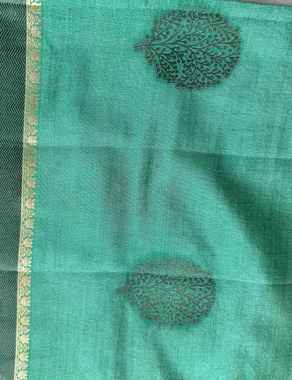 Graceful Emerald Green Pure Tussar Silk Saree with Zari Leaf Motifs and Elegant Border