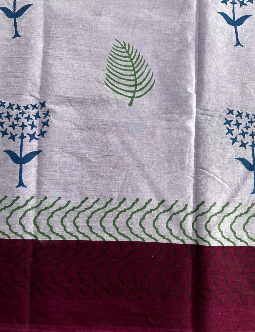 Beautifully decorated with handblock-style leaf and abstract wave prints in soothing green and blue hues. The contrast maroon border adds a rich finishing touch, highlighting the saree’s contemporary yet ethnic appeal.