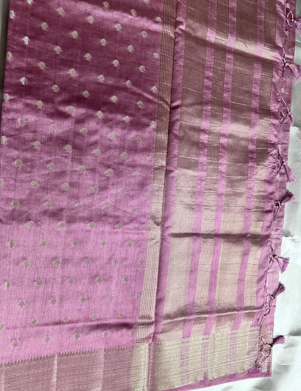 An elegant Tussar silk saree in a beautiful lavender-pink tone, adorned with intricate silver zari butta motifs across the body. The saree features a refined contrast woven border and tassel detailing, blending subtle charm with festive sophistication. Ideal for weddings, poojas, and elegant traditional gatherings.