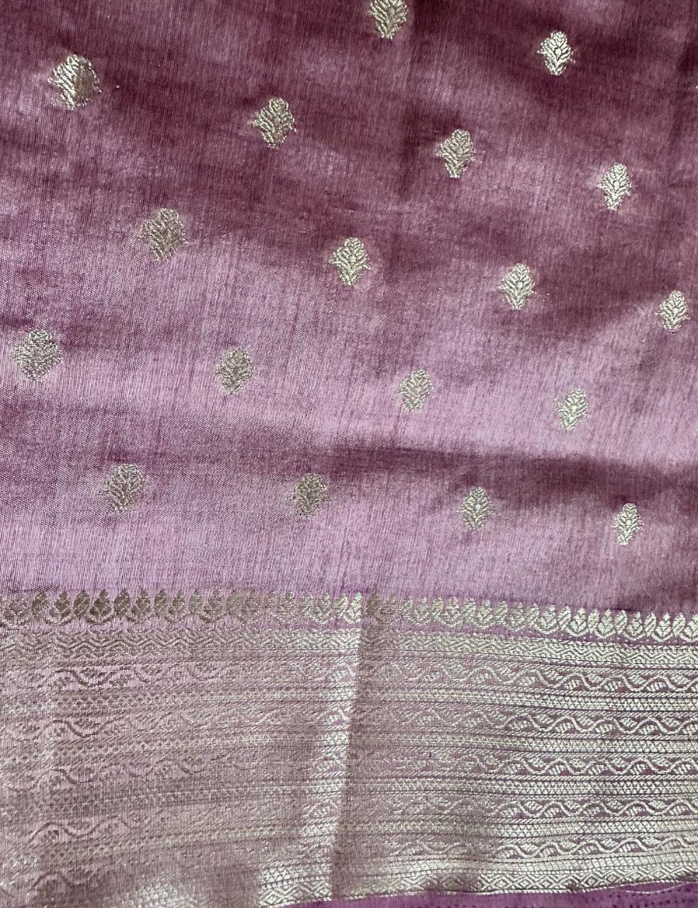Lavender Pink Tussar Silk Saree with Silver Zari Butta and Contrast Woven Border