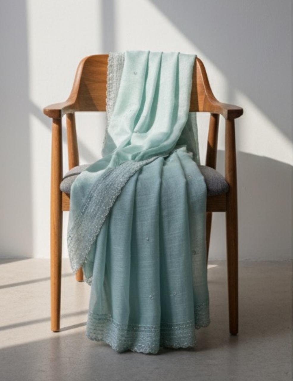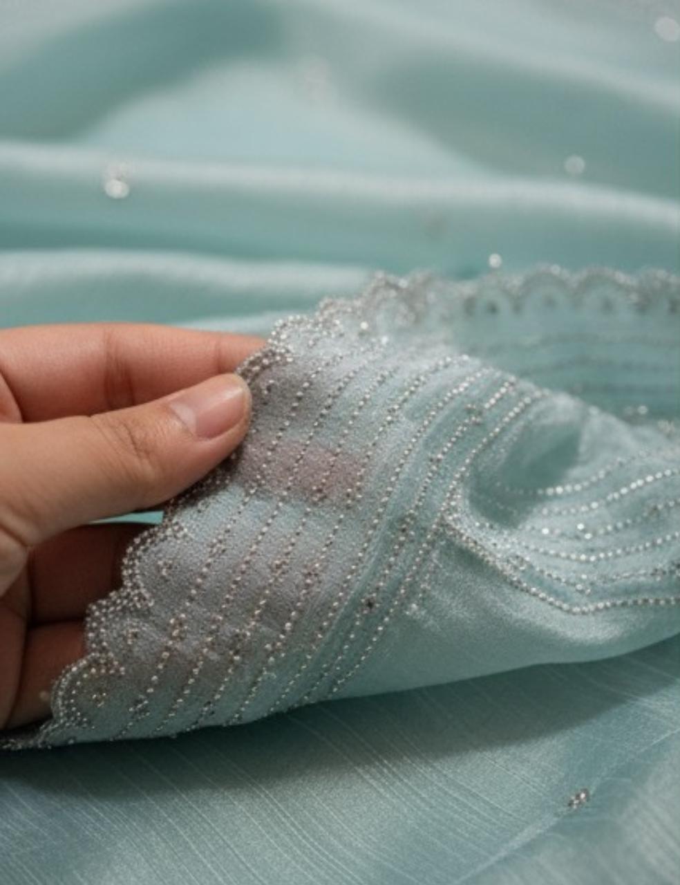 "A graceful light sky blue space silk saree featuring a shimmering stone work border. Elegant, lightweight, and perfect for festive occasions, parties, and celebrations."
