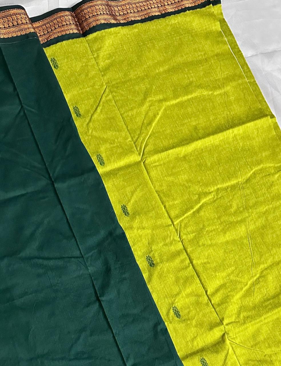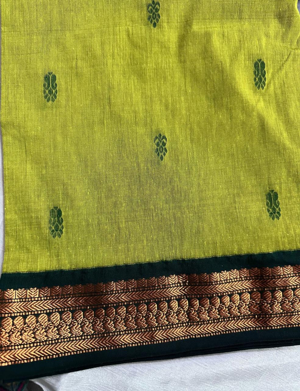 Parrot Green and Bottle Green Kalyani Cotton Saree with Copper Zari Peacock Border
