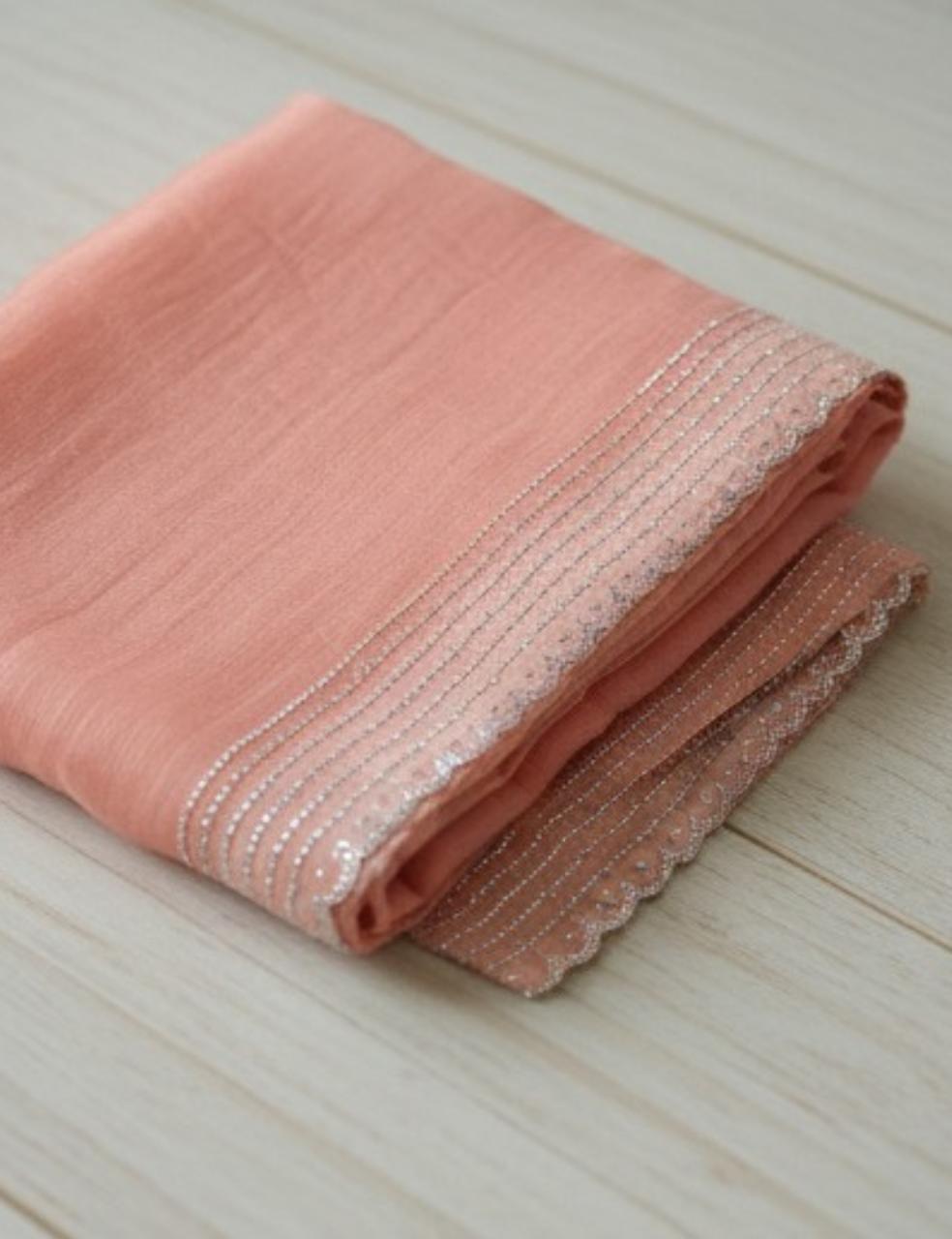 "A charming peach silk saree highlighted with silver stone border work. Lightweight, elegant, and perfect for festive occasions and celebrations."