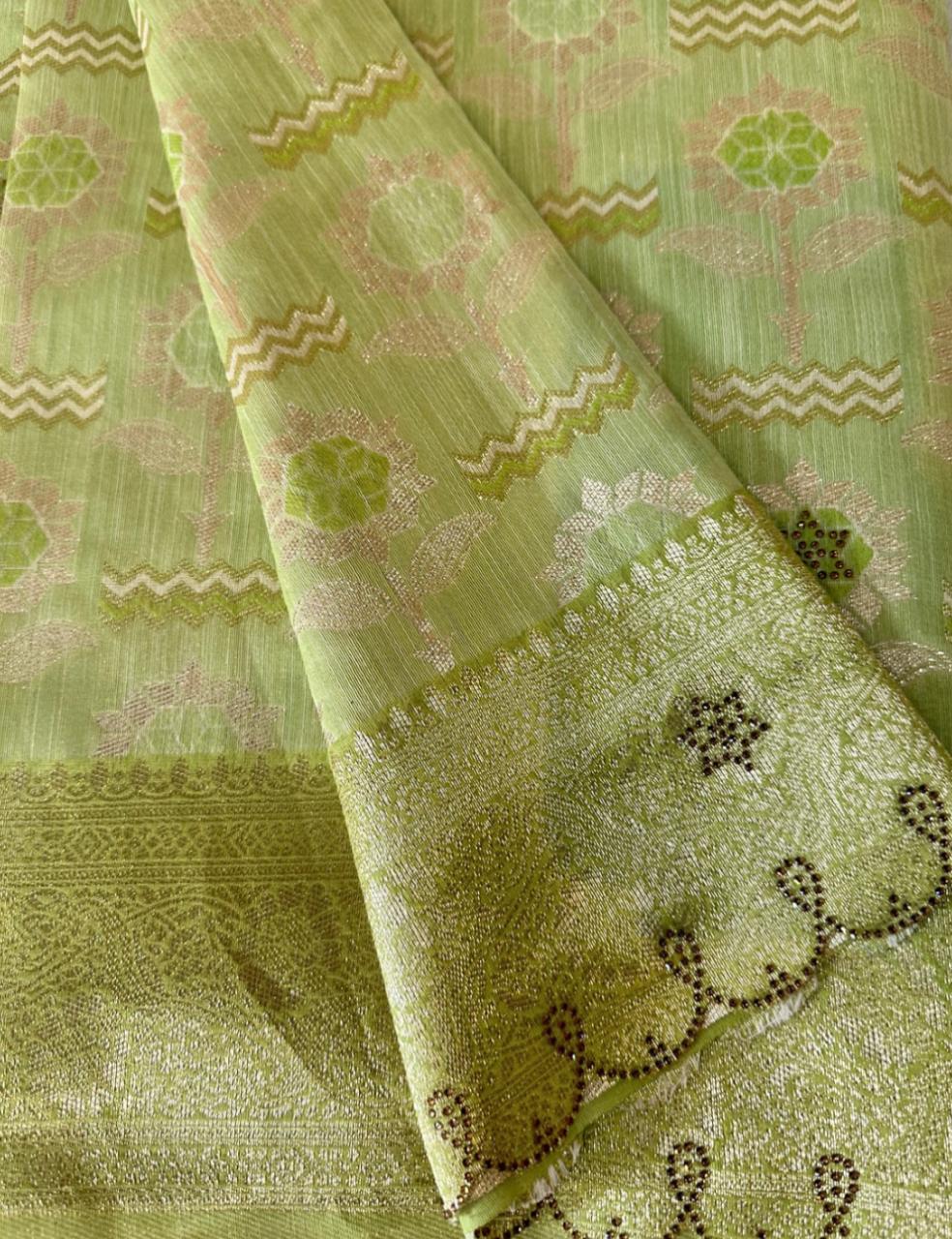 • Fresh parrot green base with elegant all-over floral woven motifs