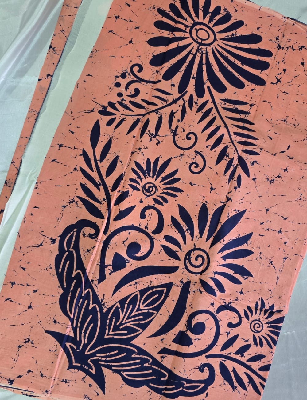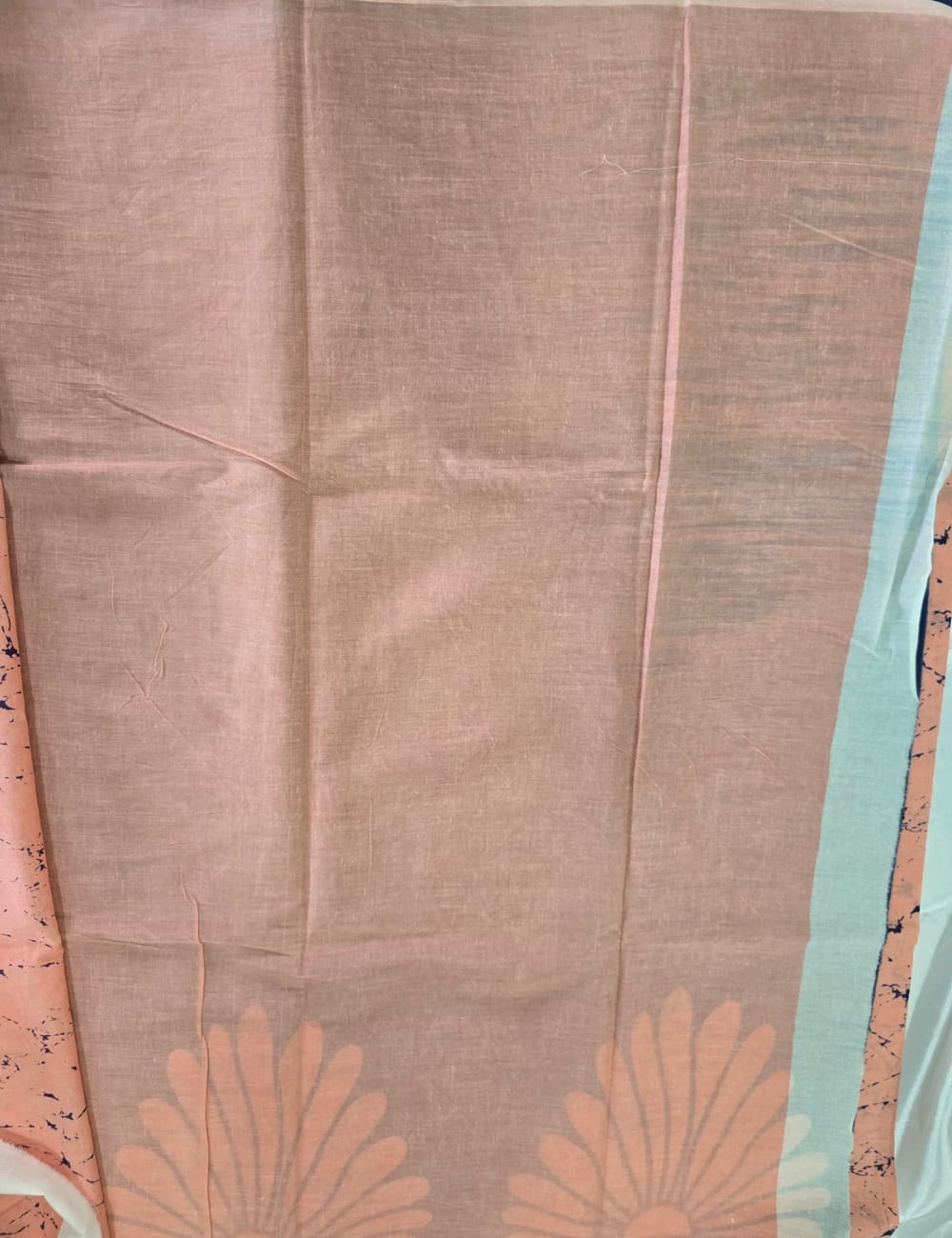 Make a refined statement with this Peach Mulmul Cotton Saree, featuring an artistic navy blue floral motif complemented by a marble-effect texture. The soft peach hue brings calm elegance, while the bold navy print adds a striking, modern edge.