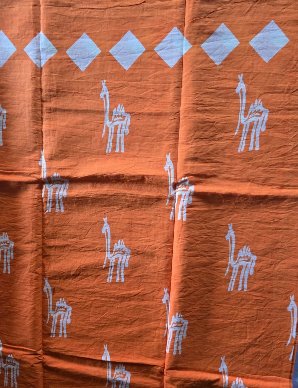 Step into effortless elegance with this Orange Mulmul Cotton Saree, adorned with graceful white bird motifs and geometric patterns that add a touch of artistic simplicity to your look.