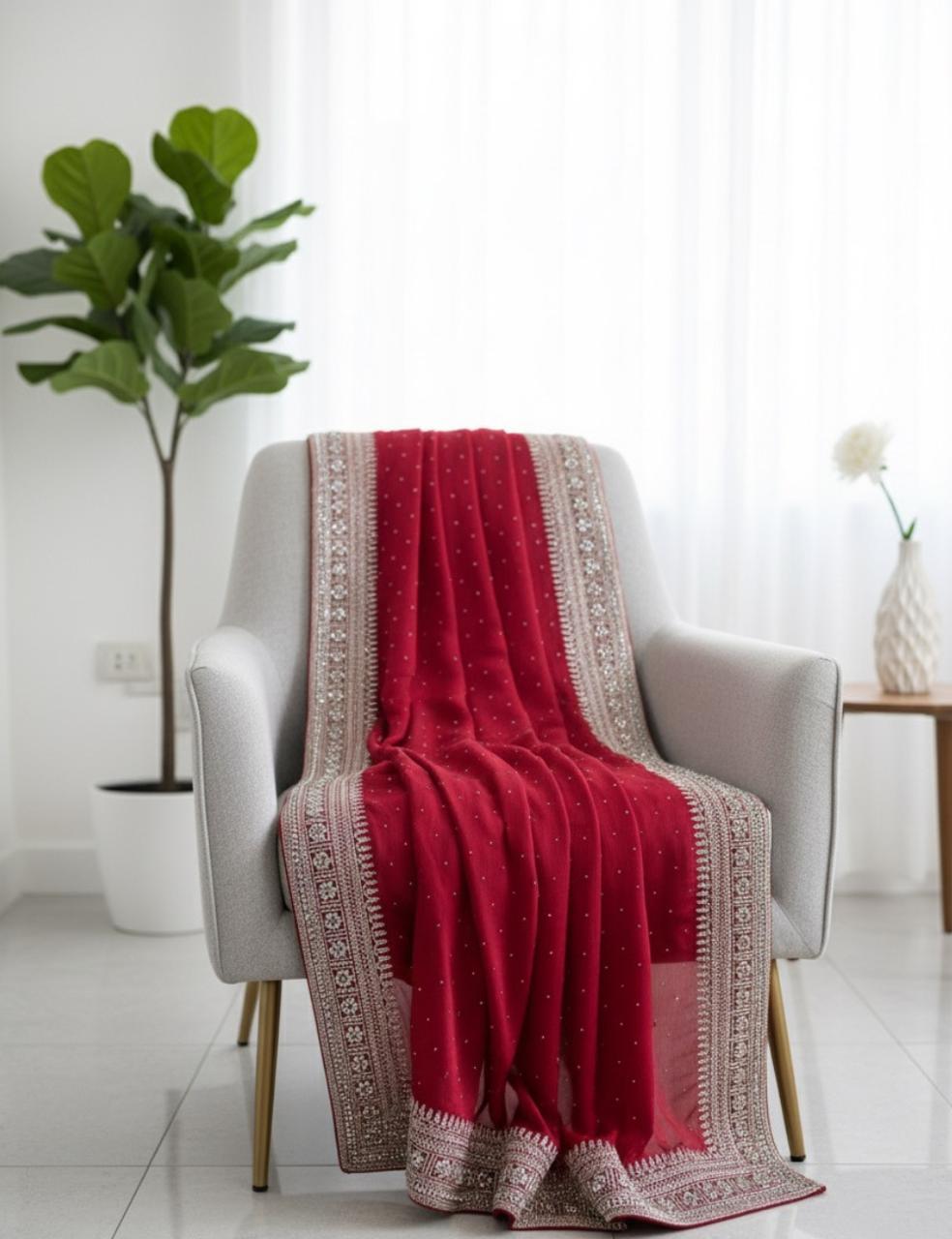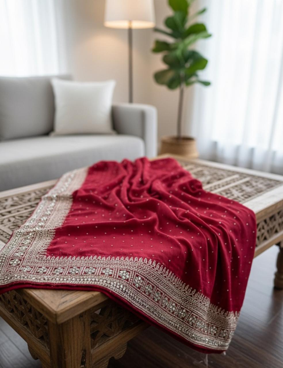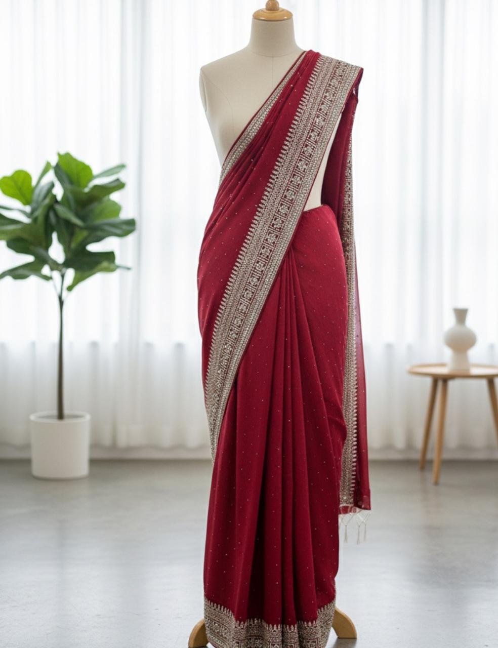 "A striking rani pink party wear saree embellished with shimmering silver stones and mirror work along the border. The scattered stone detailing across the body adds a graceful sparkle, making it a stunning choice for weddings, receptions, and festive celebrations."