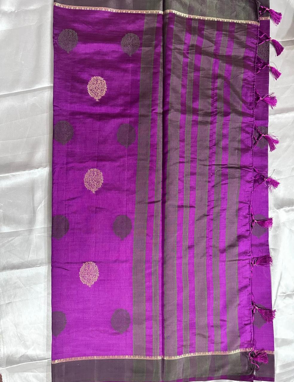 An exquisite Tussar silk saree in a rich royal purple hue, adorned with golden and deep block-printed leaf motifs. The saree features a subtle sheen with a sophisticated charcoal border and playful tassel finish, blending traditional craft with timeless style. Perfect for festive and elegant occasions.